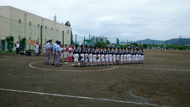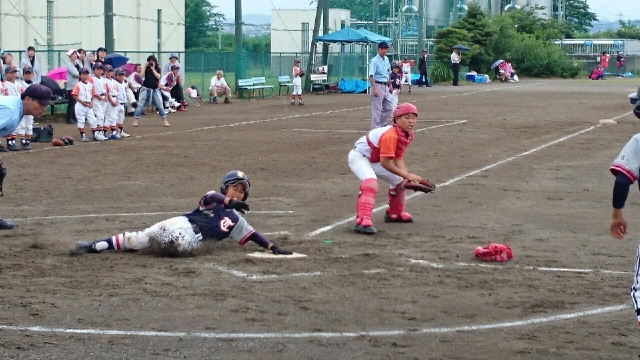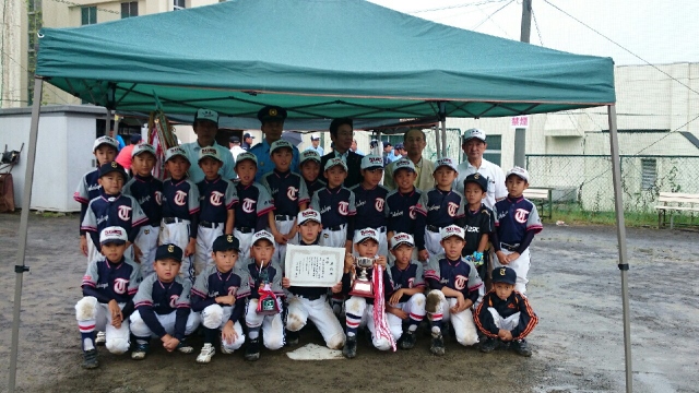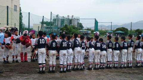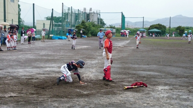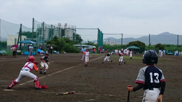 | 夏季大会 決勝 VS伊勢原フレンズ 両投手とも立ち上がりは無難にこなし、2回の攻撃時、 タツキのホームランが飛び出し先制。 続く3回にはツーアウトから相手エラーで出塁するとヨウタのレフト前で チャンスメイクし、トウキのあたりはセカンド内野安打。その間に2者生還し 3-0。しかし守りでは2個のワイルドピッチと2死1塁からのレフトエラーで 同点に追いつかれそのまま特別延長。相手を2点に抑え、最後の攻撃。 内野ゴロと、WPで同点。タカトのレフト前からチャンスを作り、 最後はユウトが汚名返上のライト前でタイヨウが2塁からの激走で生還。サヨナラ勝ちでした。 中盤以降、雨が降りしきる中のゲームでした。 びしょ濡れになりながらの応援、ありがとうございました。 これで優勝チームに与えらえる、第38回関東学童軟式野球神奈川県予選に出場が決定しました。 |
